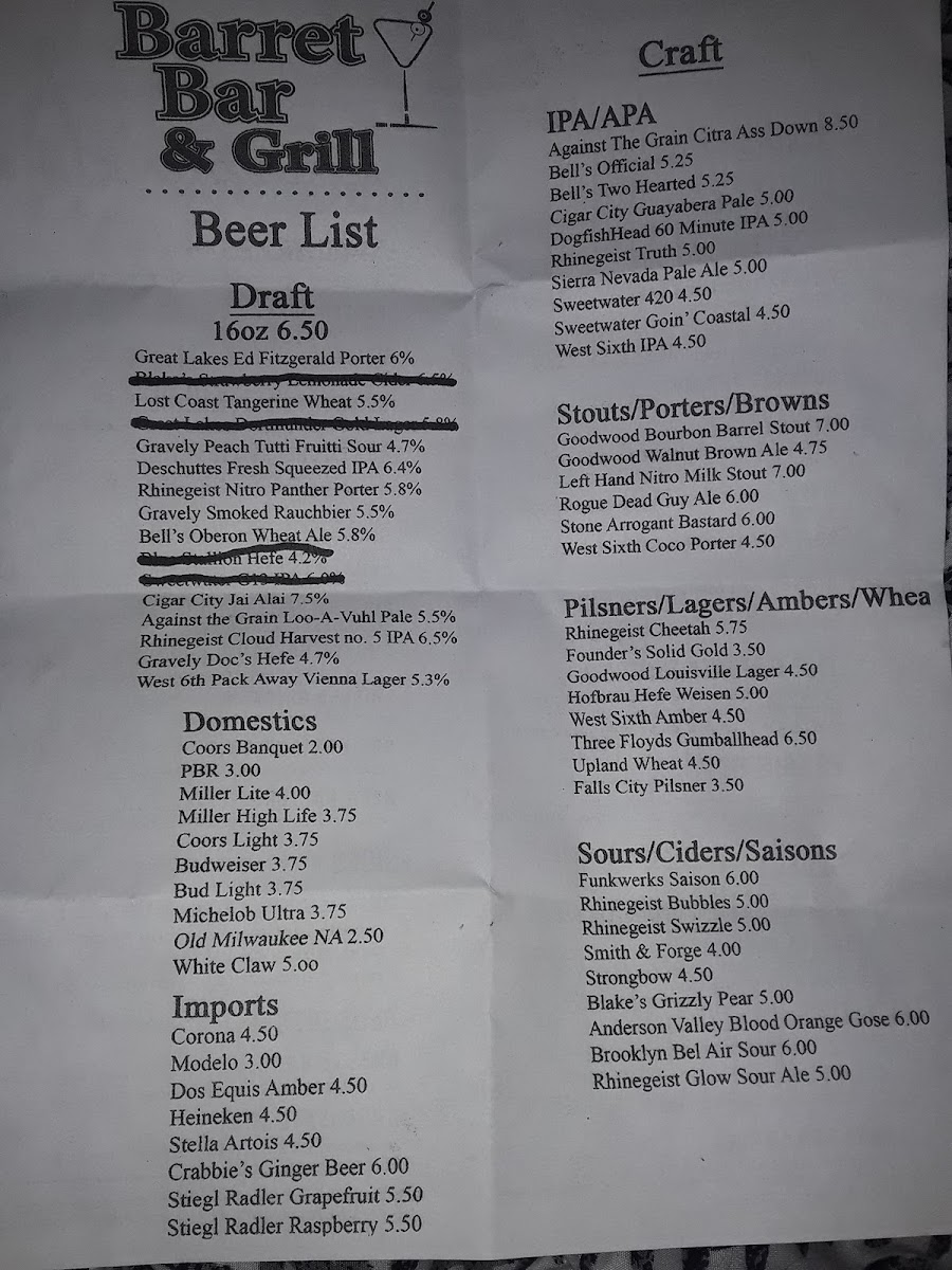 Barret Bar & Grill Menu